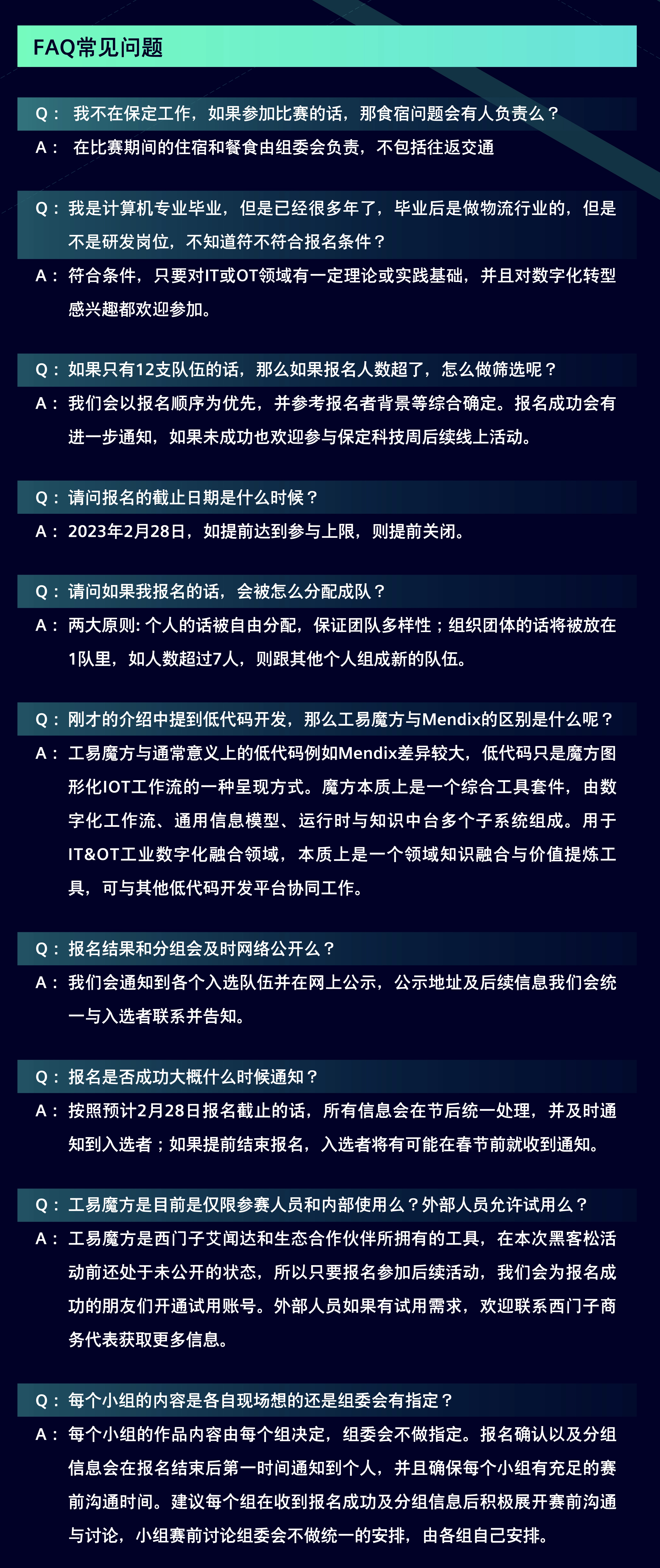 每个团队将分配一名随队教练,教练由西门子艾闻达事业部及西门子中国研究院技术专家担任。报名结束后,随队教练将组织内部技术答疑、赛前讨论等准备工作。